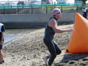 またこの川崎港のスイム独特のコース設定で、スタート地点に戻ってきて折り返す際に一度砂浜にあがってからまた戻って入水というスタイルだったのですが、ホンの10mほどとは言えこれがなかなかにキク。