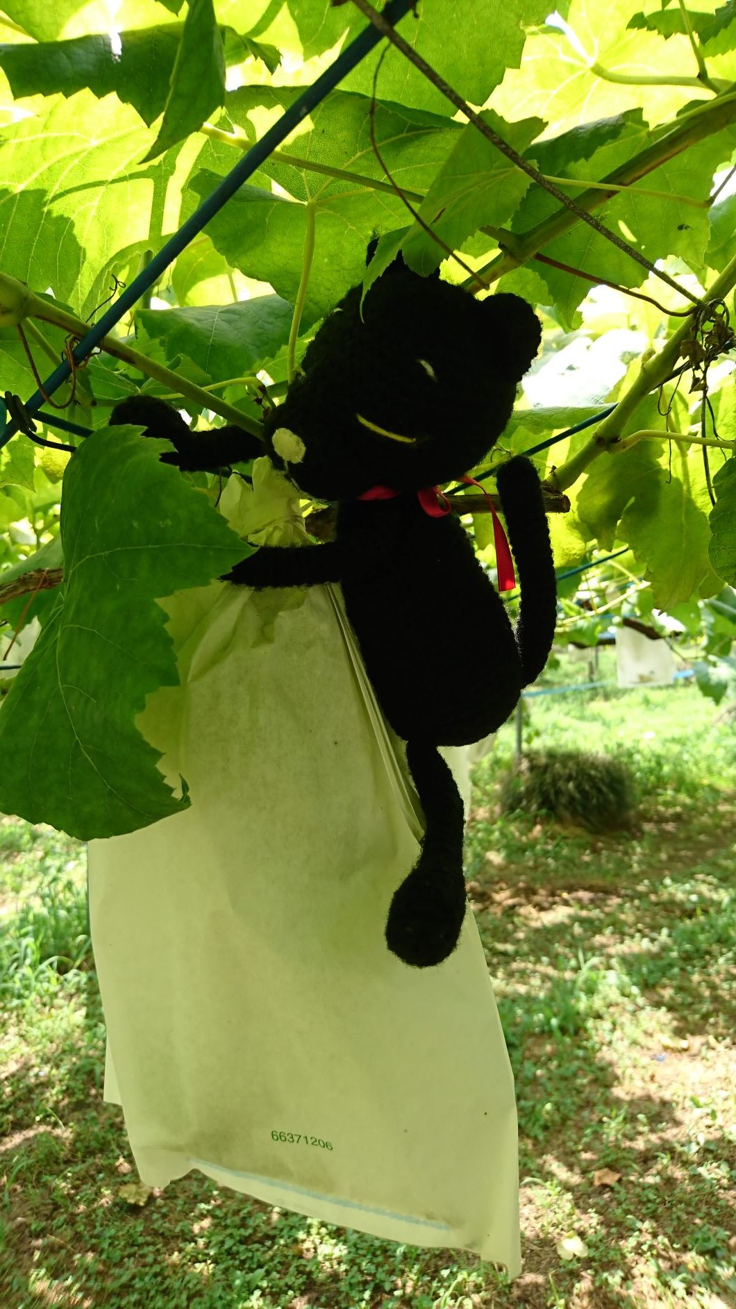 と、いうわけで、畑で物色。ヒムロットは緑色の種類のブドウなので、黄色がかった緑色のものが熟れた房です。紙袋の隙間から色と房の大きさで取るものを選びます。