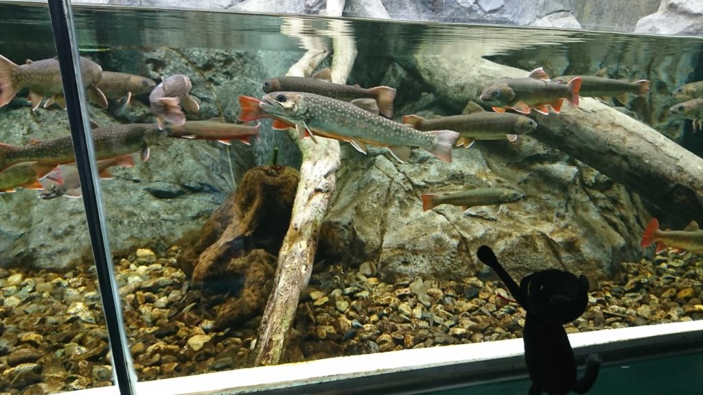 入場料を払って入館。まずはアユがたくさん泳いでいる筒状の水槽がありました。中で水流ができているのか一定方向に向いています。ホバリング状態のアユもいます。経験があるアユだと水流が弱いいい場所を見つけられたりするのかなぁ。