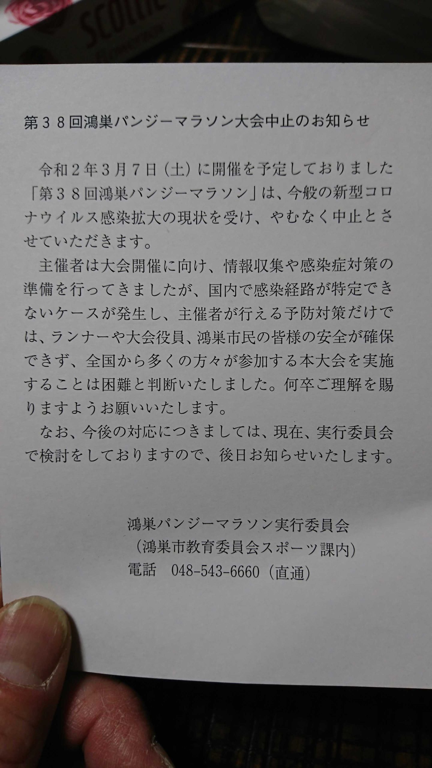 ・3月に参加するはずだった鴻巣ハーフマラソンが中止