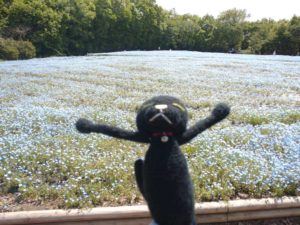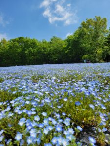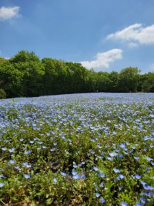 モデルさんを撮っているカメラマンの方がチラホラ見えます。そして、何かのキャラクターに扮した2人の女性の姿‥。その後ろを歩く袴姿の子もいます。みんな、ネモフィラとともに写真を撮っています。