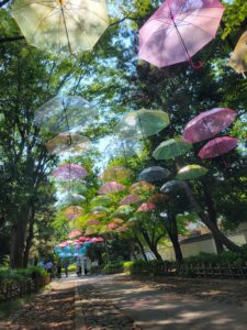 ブラジル!ブラジル!というわりには公園には30分くらいの滞在でした。渡し船、何回乗っても飽きないかもしれません。来た時と同じコースを帰りますが、気温が上昇したのでさらにこまめに休憩を取ります。私たちが忍城に行ったことがないと言ったら、近いからちょっと寄っていくかと寄ってくださいました。傘の飾りつけがあって、お天気もよかったのできれいでした。