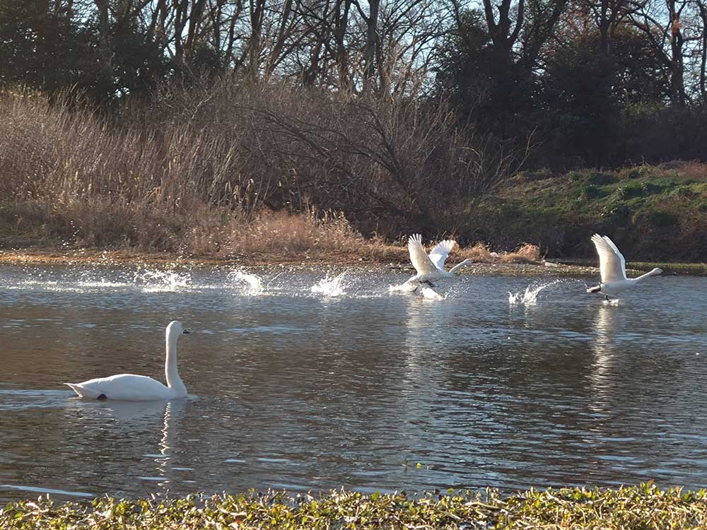 見ていた人たちからは「今日はすごいね」という言葉が聞こえたので、この日はよく飛んだ日なのだと思います。でも、9時を過ぎると白鳥の動きはすっかりおとなしくなり、静かになってきました。もう飛びそうもないので、神社へ向かうことにしました。