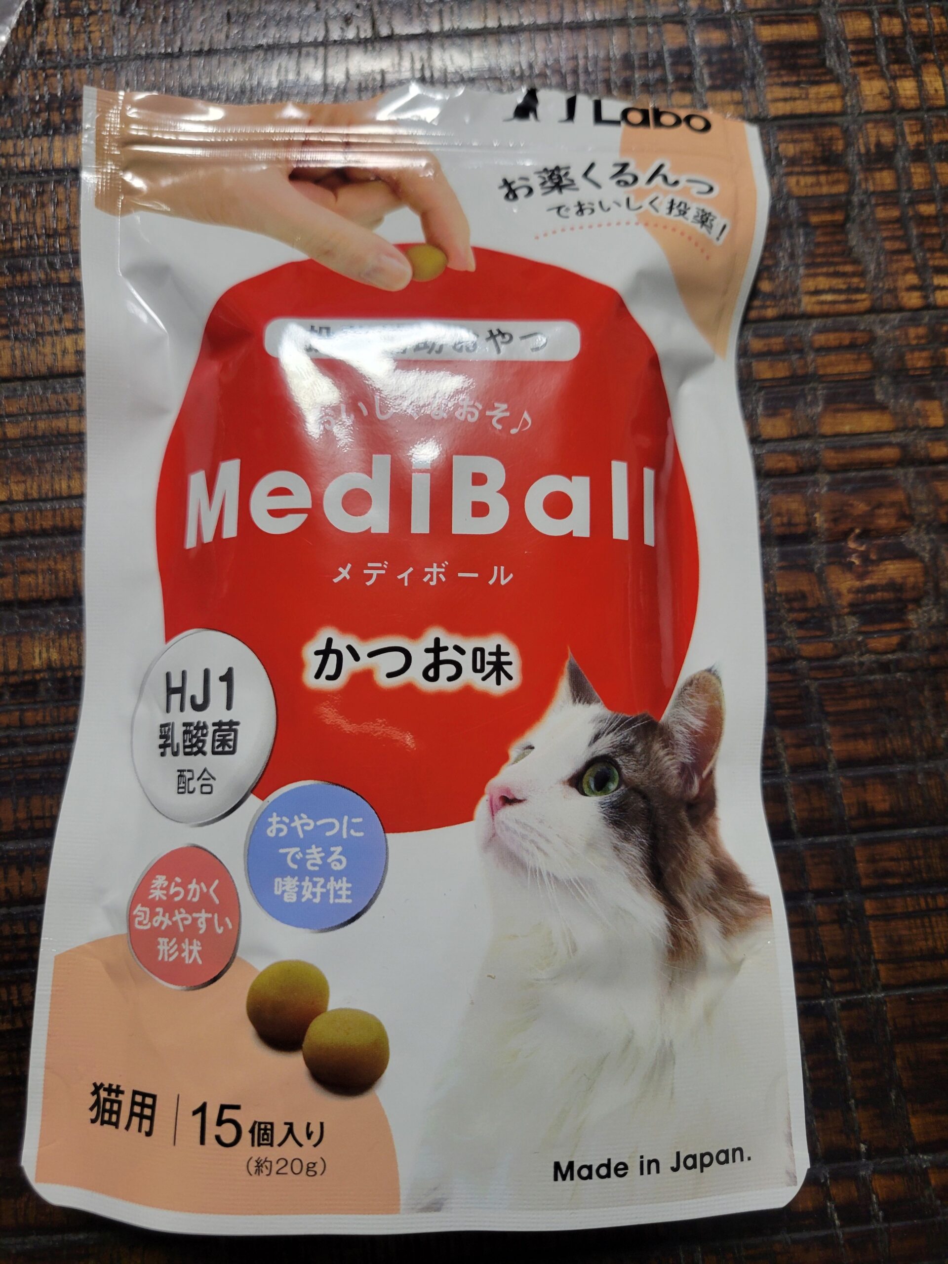 ボール状のものをつぶして薬を包みます。少し大きいかなと思いましたがすぐに食いつきました。2~3口で食べ切る様子でした。