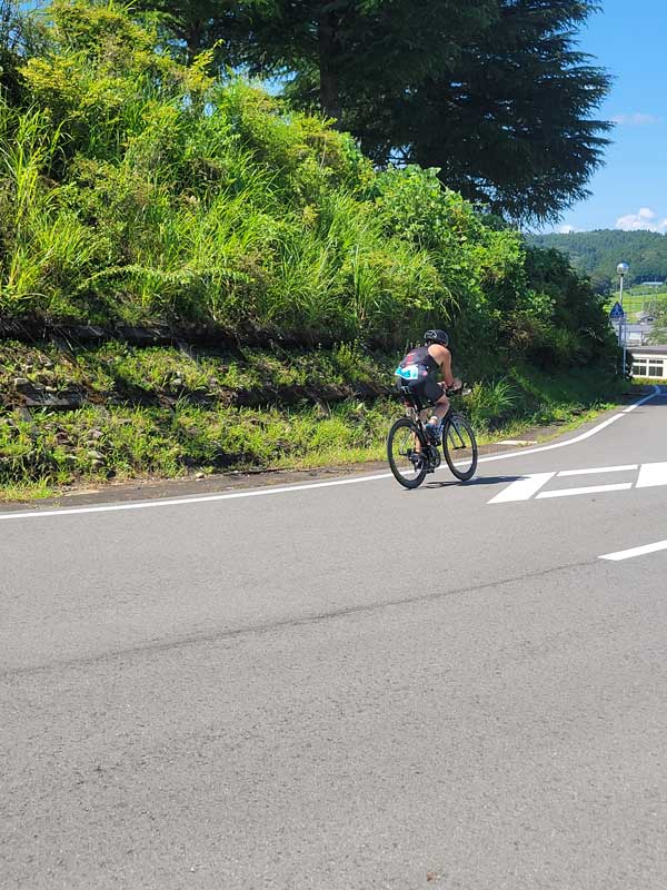 斜度はそれほどでもない登りですが、それなりの距離があるのに加えて忘れちゃいけないコレはトライアスロン。2往復の後に10㎞ランニングが待っていると思うと絶望したくなる坂です。